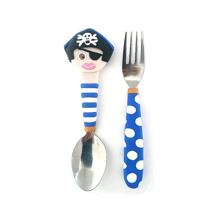 Das Besteck ist aus Edelstahl und die Sets sind in Blau oder Rot erhältlich. Die Griffe sind aus Fimo, ungiftig und perfekt für kleine Hände. Die Piraten-Kombination und die leuchtenden Farben sollten jedem Kind Spaß machen, etwas über Essen zu lernen. Sets können auf Bestellung in Rot und Weiß oder Blau und Weiß hergestellt und auf Wunsch mit einer Initiale auf der Rückseite des Löffels personalisiert werden.